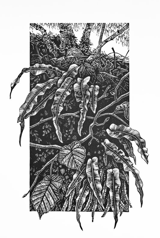 Each piece begins with time spent observing and sketching from nature - fallen leaves, tangled roots, and delicate petals. From these drawings, I carve the image into a block of linoleum using fine tools, cutting away the areas that will remain white on the final print. Ink is then rolled onto the surface, and each print is pressed by hand, one at a time.