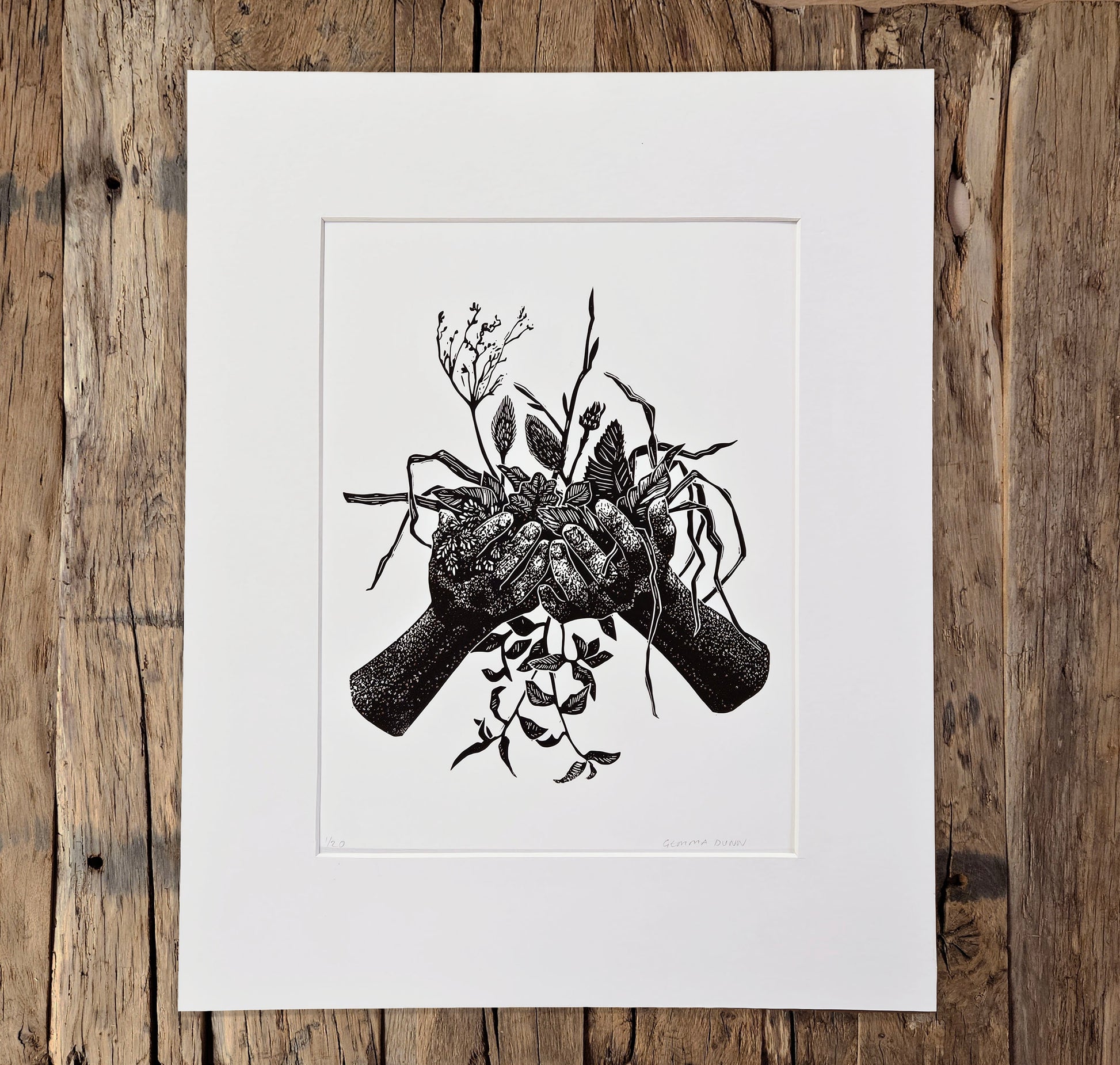 Gathered is about cherishing the messy, imperfect beauty of the natural world. This linocut is everything I feel about nature - my joy in gathering, treasuring and offering back a reflection of what I see into the world