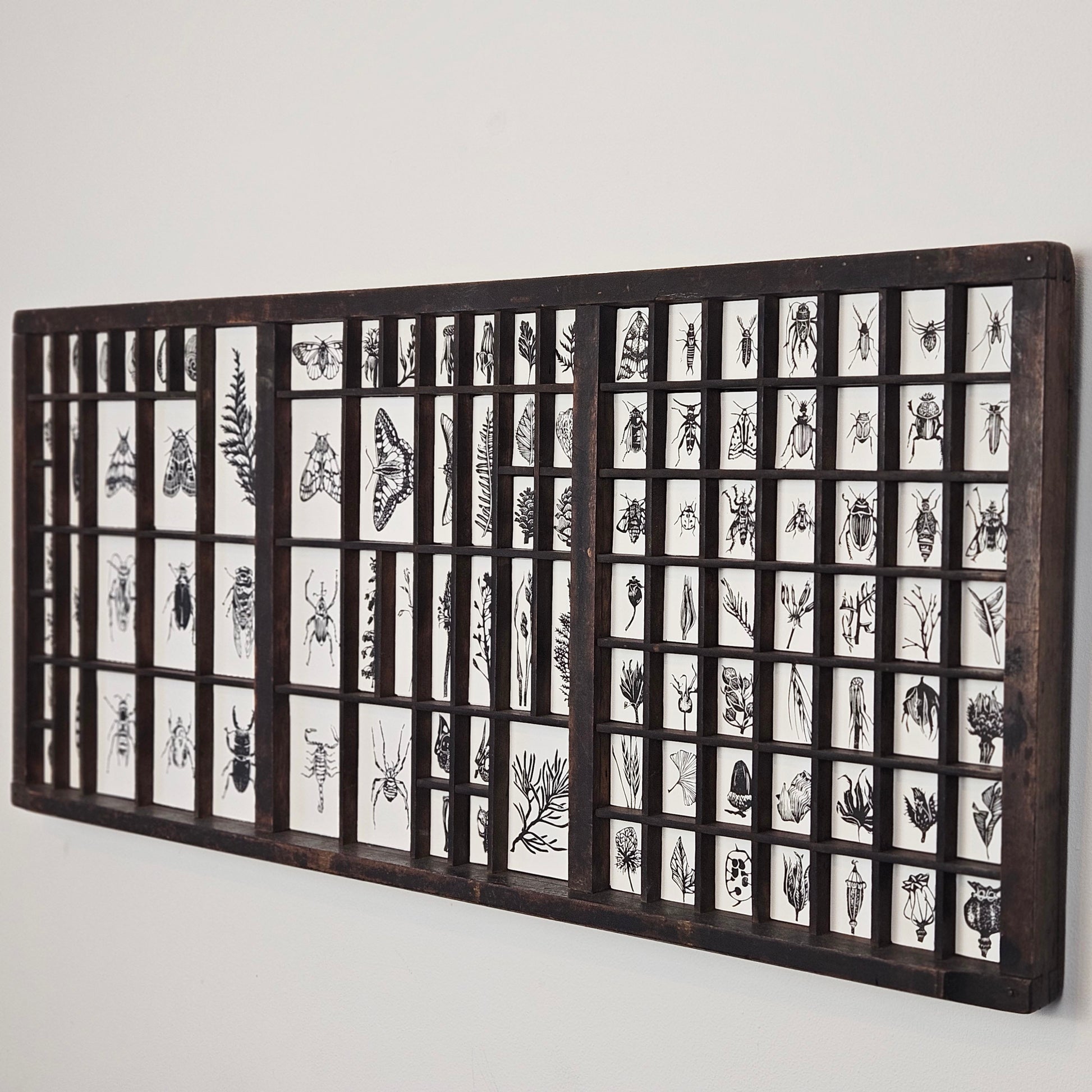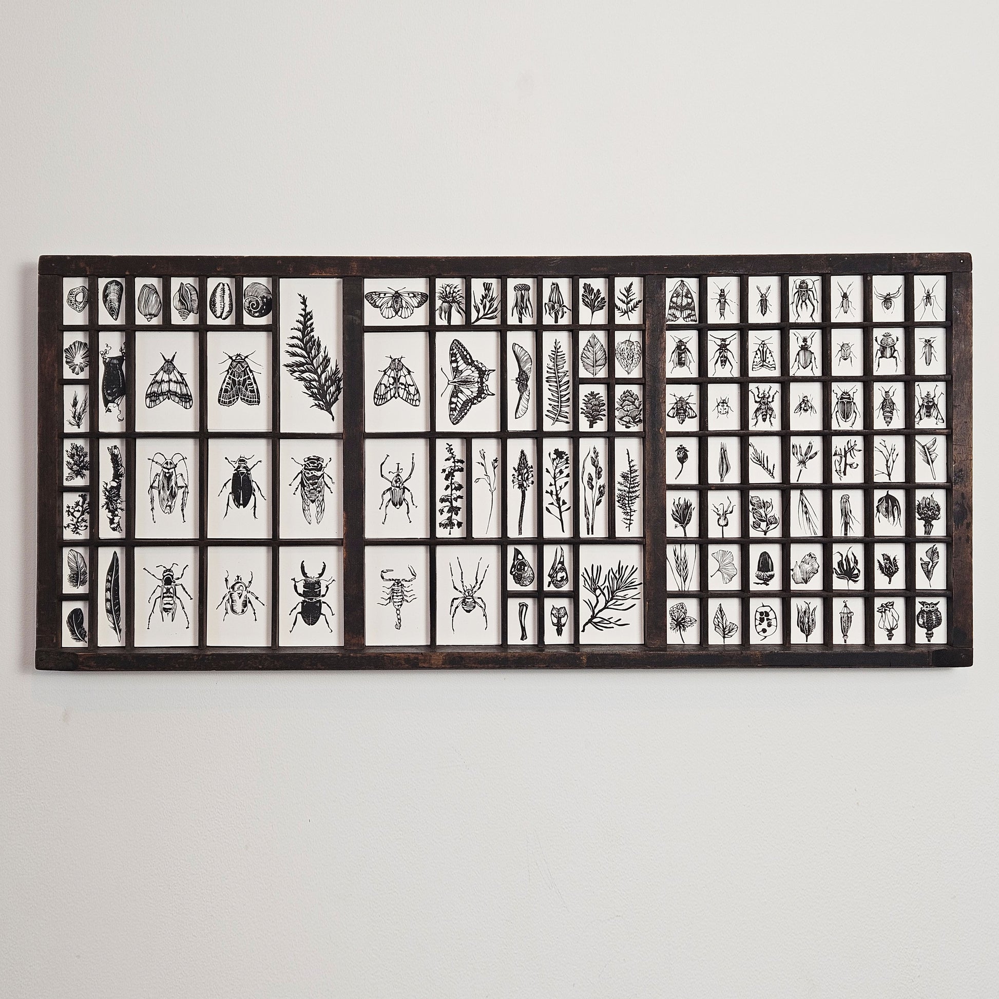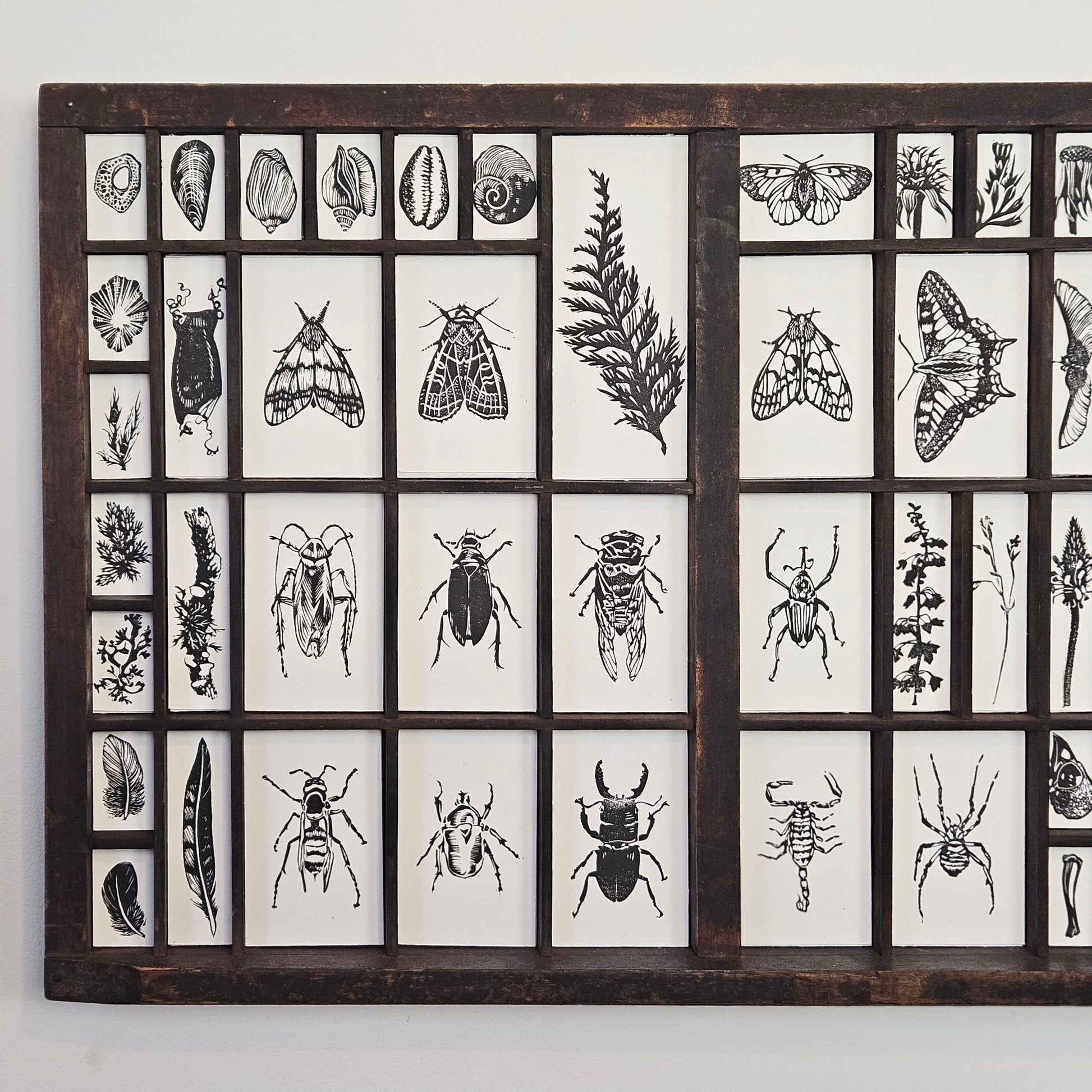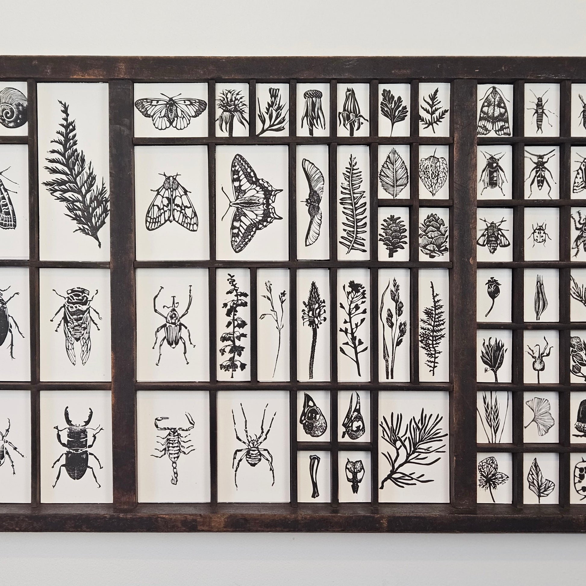 Treasures is a collection of 102 tiny hand printed linocuts, each carefully observed from nature. Working on this collection has taken me back to the way I studied nature as a child, exploring, gathering and cherishing each small find. I kept my collection in a vintage letterpress tray displayed proudly on my wall - and so it is with this project.
