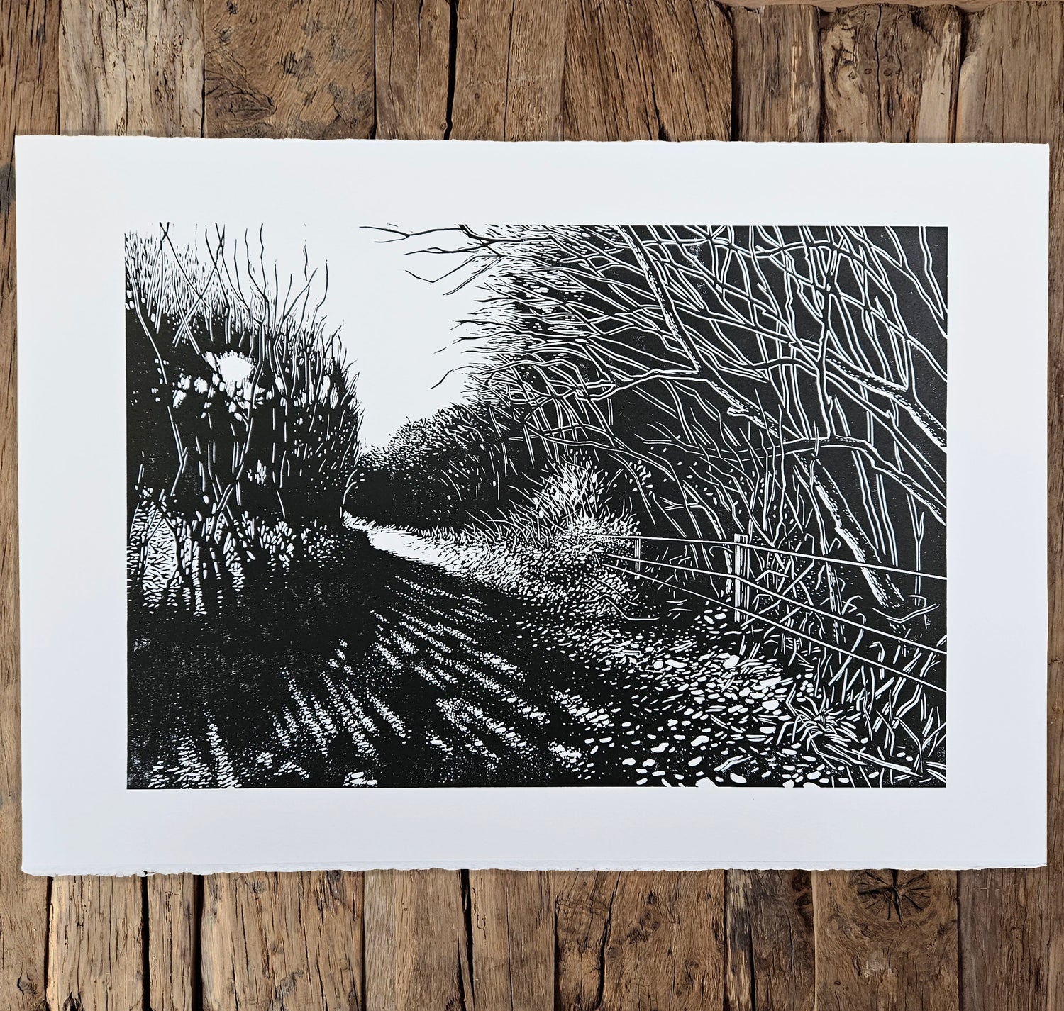 Printed by hand on beautiful 300gsm hot pressed watercolour paper, this piece captures fine detail and subtle texture. Each print is unique, with slight variations that are part of its handmade character.